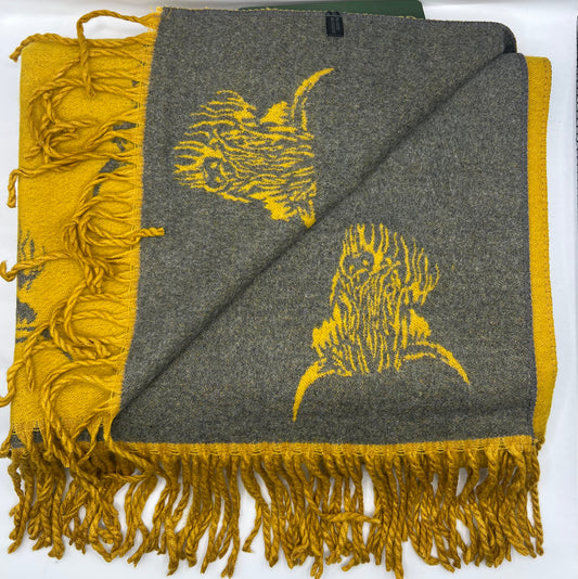 House Of Tweed Highland Cow Scarf Mustard & Grey